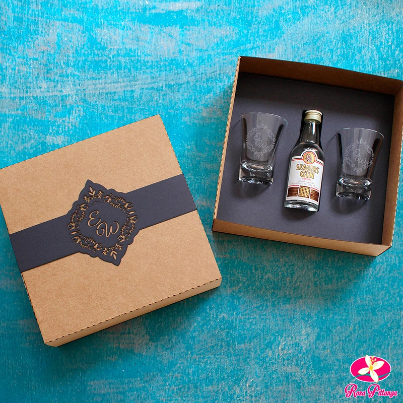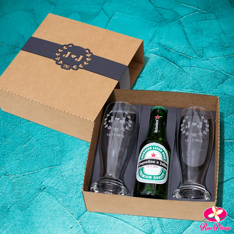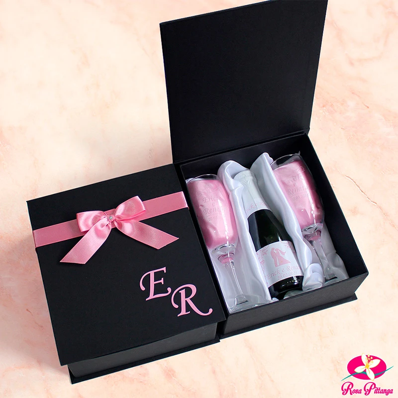 Com caixas em papelão Paraná ou MDF, taças ou copos e espumante ou vinho, esses kits são totalmente personalizáveis de acordo com a preferência do cliente. São muito requisitados como lembranças de casamento e brindes corporativos.