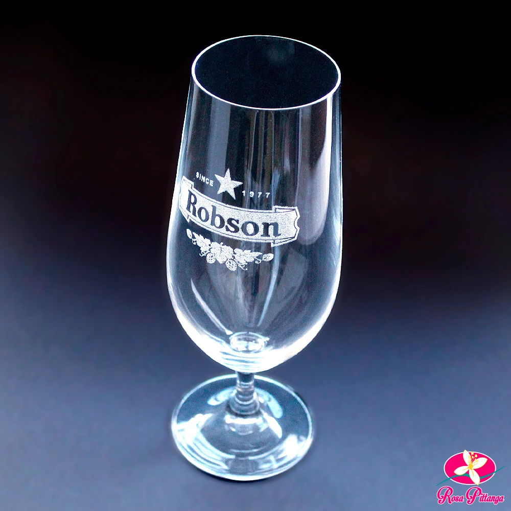 Para eventos sociais e ações corporativas, a Rosa Pittanga oferece taças e copos em vidro, cristal ou acrílico, que podem ser personalizados a laser ou com impressão colorida, de acordo com o material escolhido.